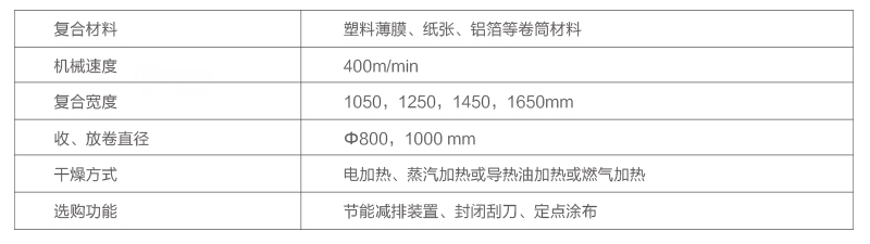 收放卷:獨(dú)立塔式雙工位收放料架,無軸氣頂裝置,換卷自動(dòng)裁切,放卷EPC裝置。 涂膠:直接凹版式涂布,氣動(dòng)刮刀。 烘箱:三段頂開式高效恒溫干燥箱,整個(gè)烘箱采用負(fù)壓.............